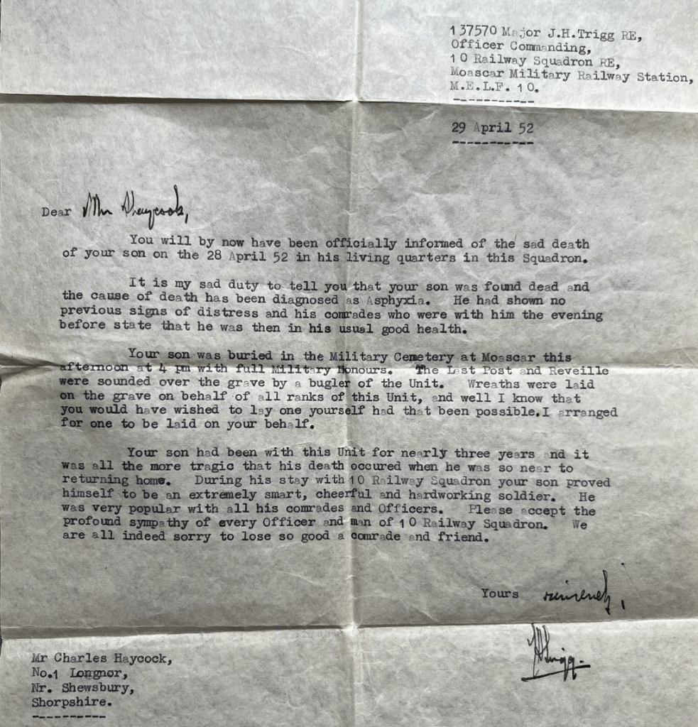 After school, and a spell working on the railways, Arthur joined the Royal Engineers (10th Railway Regiment), and was sent to Egypt to keep trains operating that were supplying the British army. It was stressful and dangerous work as the local population were hostile, and attacked the Sappers while sabotaging their efforts. Just weeks before Arthur was due home, the Haycocks received the heart-breaking news that he’d died. Arthur’s gravestone is amongst many others in the Moascar Military Cemetery in Egypt.