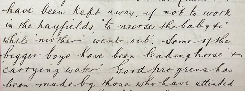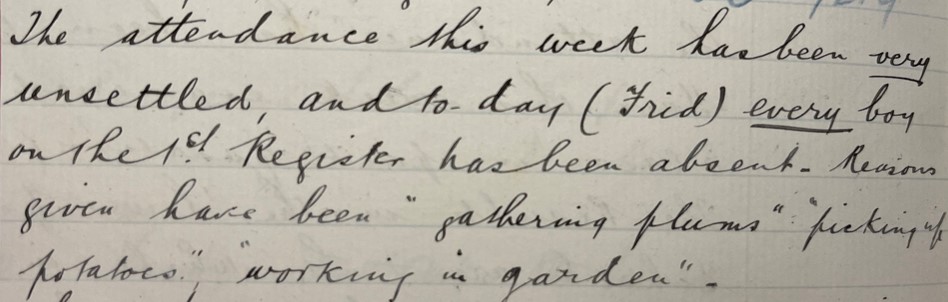 The 1880 Elementary Education Act made it compulsory for 5-10-year-olds to go to school. Despite this, attendance countrywide was very patchy. In the Longnor School log book for 1882-1900, Mr Wood, the School Master, noted his frustration.