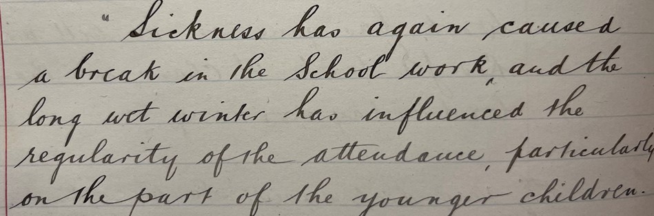 “Of those absent yesterday afternoon, 12 are present this morning: there are however 9 others who were present yesterday, absent this morning. Water being across the road at the Black Pool, several had to turn back home. Those who came through it had their feet very wet, and have had their stockings dried at the classroom fire.”
