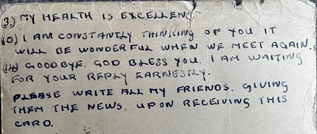 The prisoners were allowed to send a postcard home. They were given a limited number of sentences to choose from. Charlie wrote home to his Mum choosing sentences 3, 10 and 14: